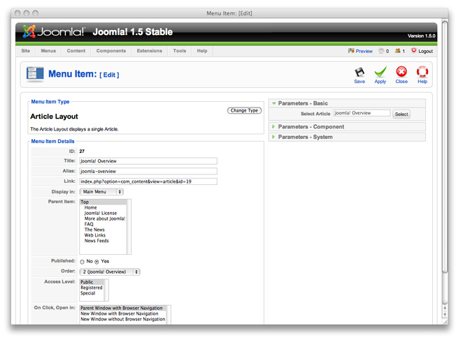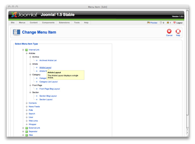The complexity of choices and steps in the menu manager for Joomla! 1.0 have been completely redesigned for 1.5 in favor of simplicity and elegance.[1] Usability improvements, such as the ability now to change the menu type[3], make changing your site much simpler. Any menu item can now be used to designate the default page. Selecting menu types is now an elegant drill down process supported by a new navigation tree; collapsible parameter sections simplify choices and increase productivity. Other helpful interface improvements include contextual tooltips and the ability to sort any menu manager column. [2]