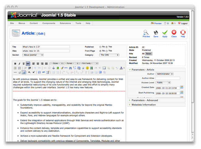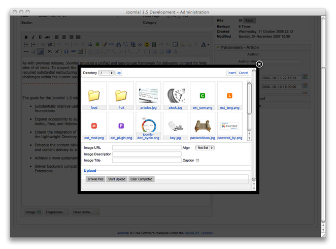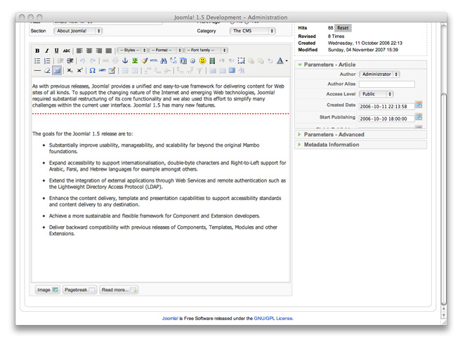 The core article manager is simpler.[6] Gone are dual editor areas from Joomla! 1.0. Now, a single editor with a "Read More" button for separating the introduction from the full article, supports a more natural writing process.[8] A very popular improvement is Joomla!'s new image manager enabling you to browse media folders to select and insert images directly into your article as you write. [7]There is also more control of article pagination than before.